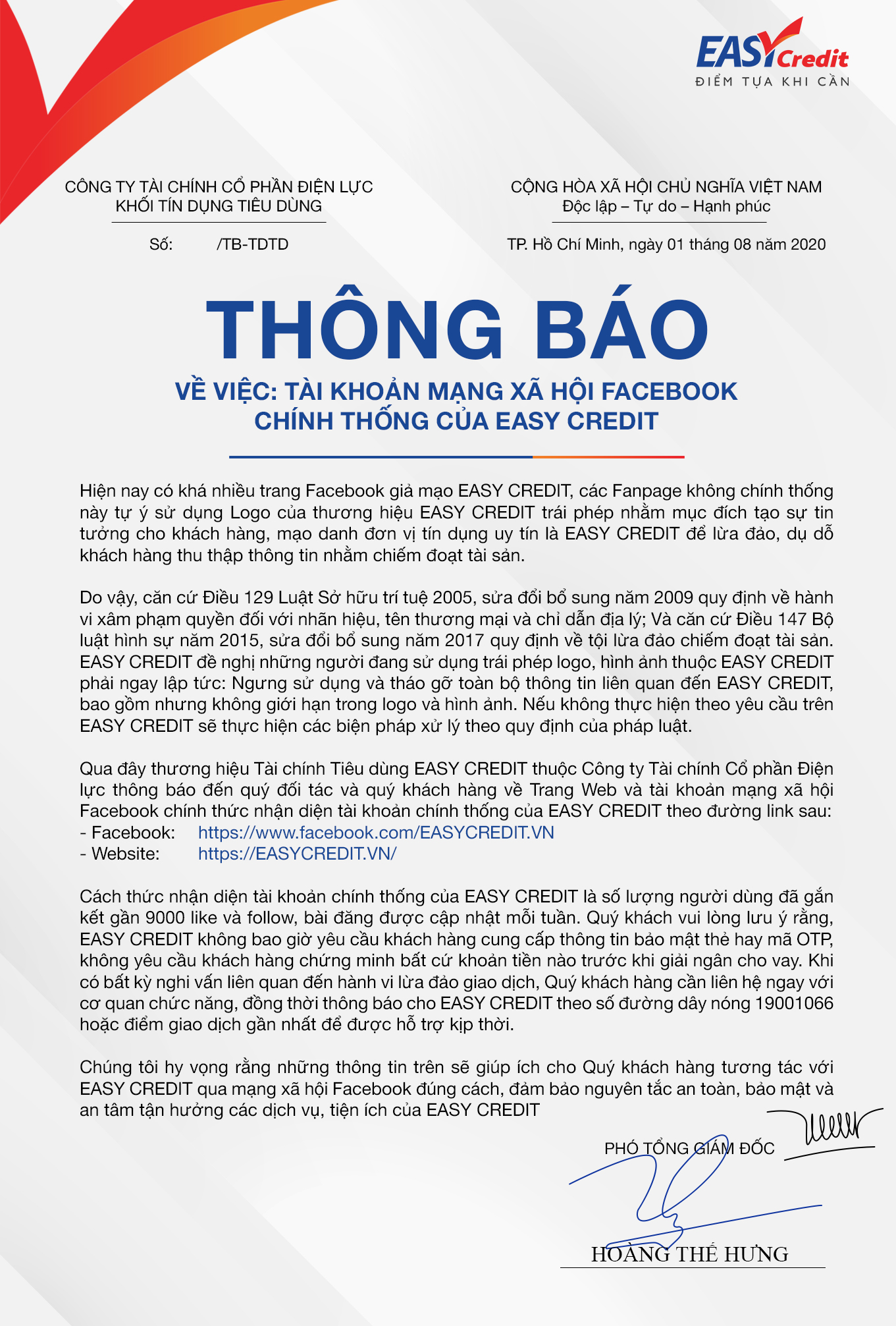 EASY CREDIT là thương hiệu cho vay uy tín thuộc Công ty Tài chính Cổ phần Điện lực (EVN Finance), hoạt động và được giám sát bởi Ngân hàng Nhà nước Việt Nam, tuân thủ mọi quy định của pháp luật.