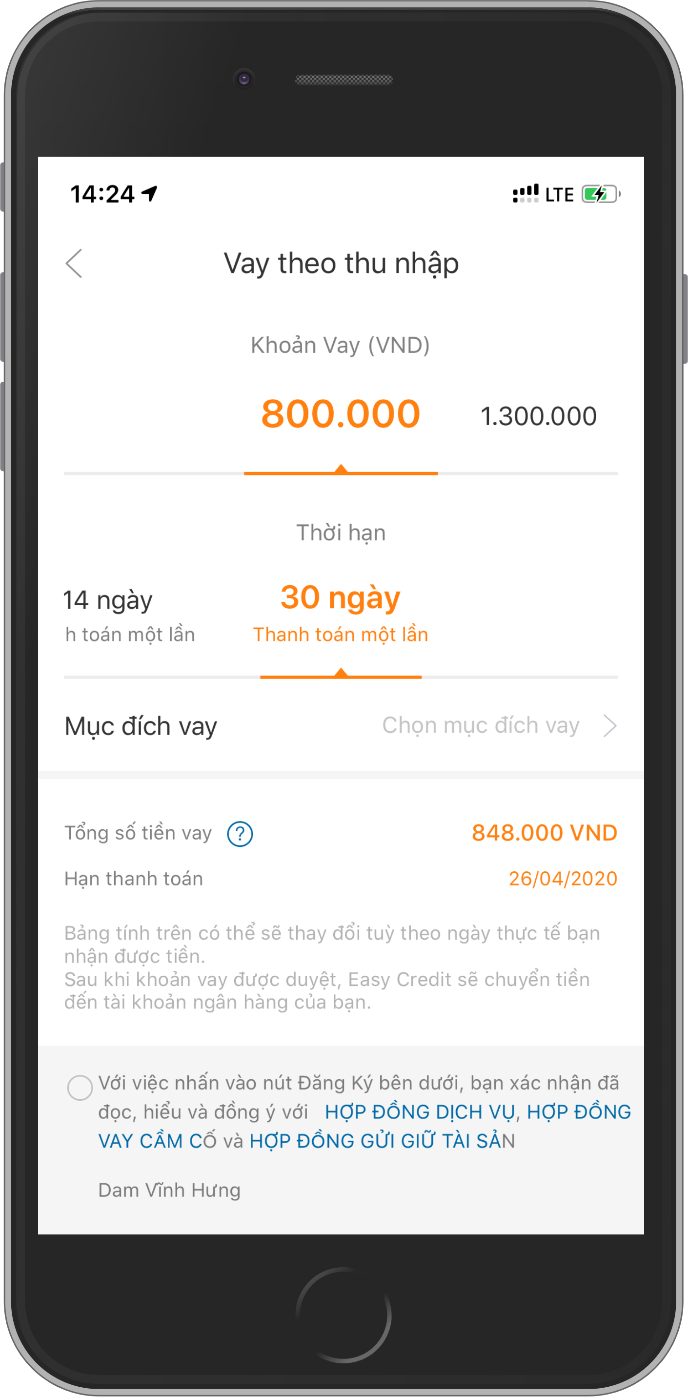 Đăng ký khoản vay & thời hạn vay theo nhu cầu Nhận tiền vào tài khoản chính chủ đã đăng ký