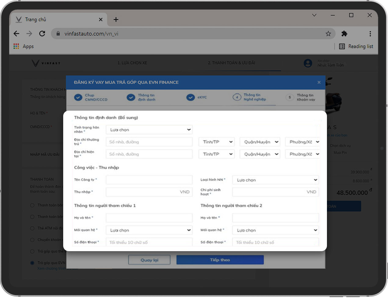 Khách hàng nhập đầy đủ thông tin trong màn hình tiếp theo, bao gồm: Thông tin định danh (bổ sung), thông tin công việc, thu nhập, thông tin người tham chiếu. Sau đó, chọn “Tiếp theo” để chuyển sang bước kế tiếp.