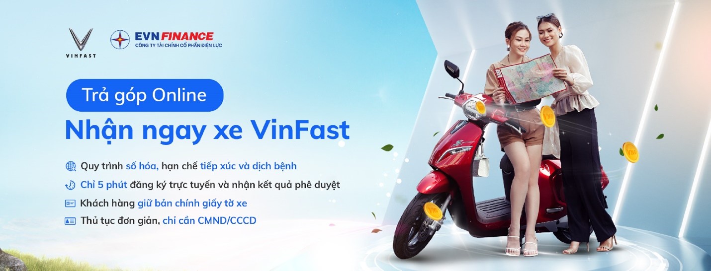 Không còn lăn tăn vấn đề tài chính, sở hữu ngay Xe Máy Điện VinFast với góp trả góp siêu tiện lợi của EVNFinance: quy trình thủ tục ONLINE 100%, nhận kết quả duyệt chỉ sau 15 phút.
