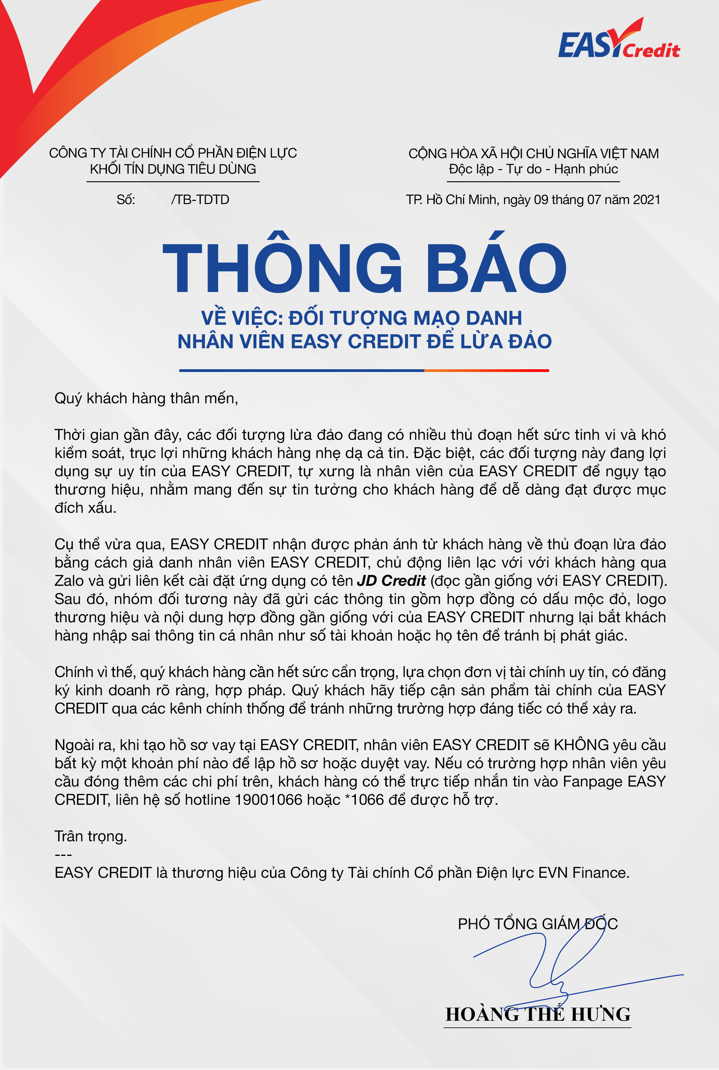 THÔNG BÁO VỀ VIỆC: ĐỐI TƯỢNG MẠO DANH NHÂN VIÊN EASY CREDIT ĐỂ LỪA ĐẢO