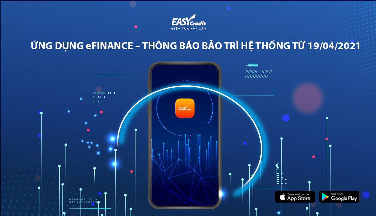 Thứ ba 20 Tháng Tư 2021EASY CREDIT xin thông báo đến quý khách, từ ngày 19/04/2021, ứng dụng vay tiền eFinance tạm thời ngưng hoạt động để bảo trì – nâng cấp hệ thống và hoàn thiện các tính năng sẵn có nhằm đem lại trải nghiệm sử dụng tốt nhất cho quý khách trong thời gian tới. EASY CREDIT sẽ sớm thông tin đến quý khách về bản cập nhật mới nhất của ứng dụng eFinance sau khi hoàn tất việc bảo trì.
